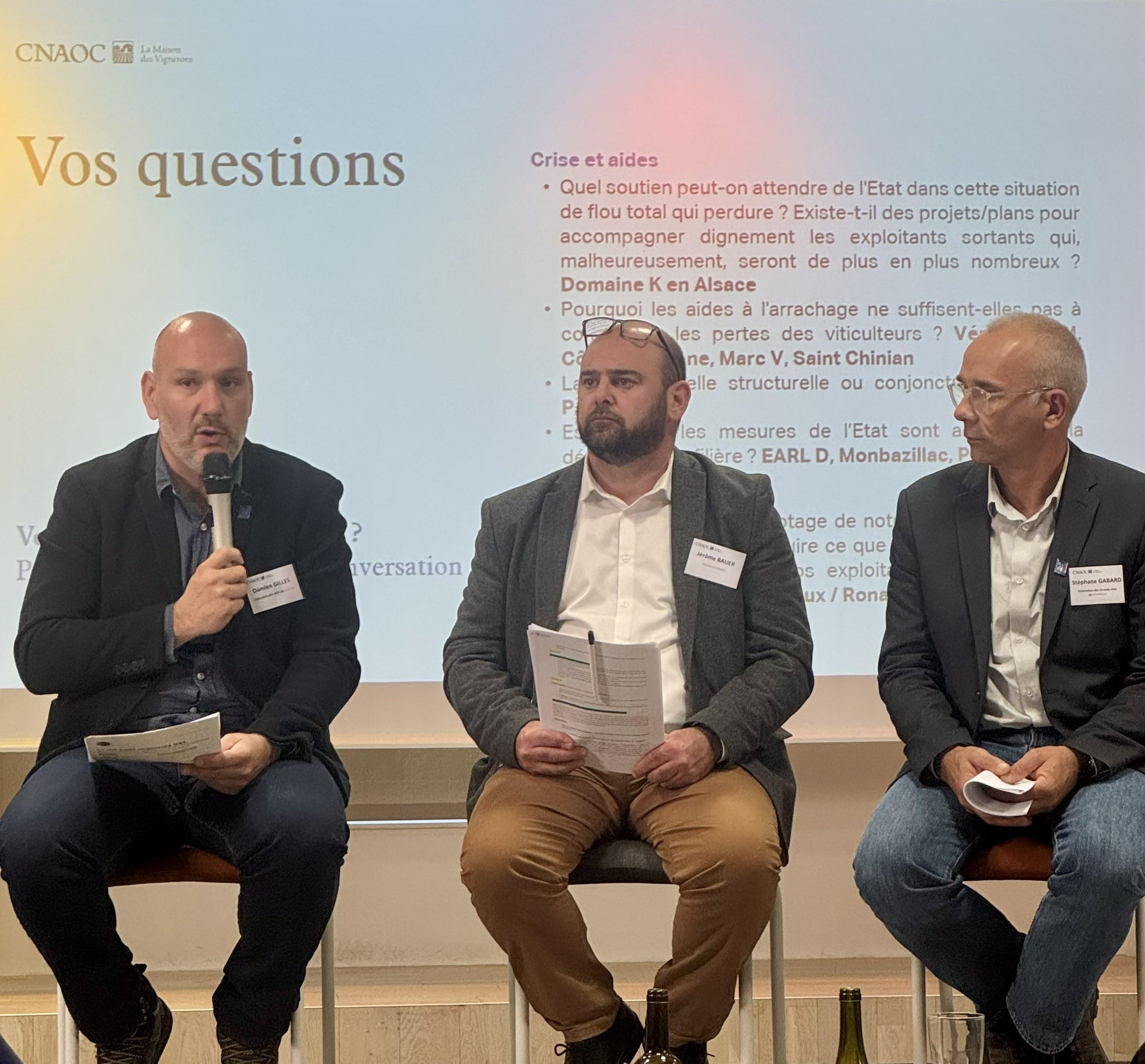 Damien Gilles, Pdt du Syndicat des Côtes-du-Rhône, Jérôme Bauer, Pdt de la CNAOC et Stéphane Gabard, en charge de la communication du Syndicat des AOC Bordeaux et Bordeaux supérieur.